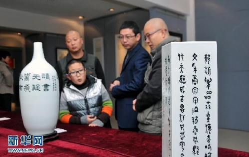 ????當(dāng)日,為慶祝黨的十八大召開,江西省景德鎮(zhèn)仲安畫廊舉行景德鎮(zhèn)青年陶瓷書法作品展。此次活動由景德鎮(zhèn)市青年聯(lián)合會、景德鎮(zhèn)青年書畫家協(xié)會和景德鎮(zhèn)高等??茖W(xué)校陶瓷文化藝術(shù)中心聯(lián)合主辦,展出當(dāng)?shù)?3位陶藝家的100件陶瓷書法作品。新華社發(fā)(石衛(wèi)明 攝)