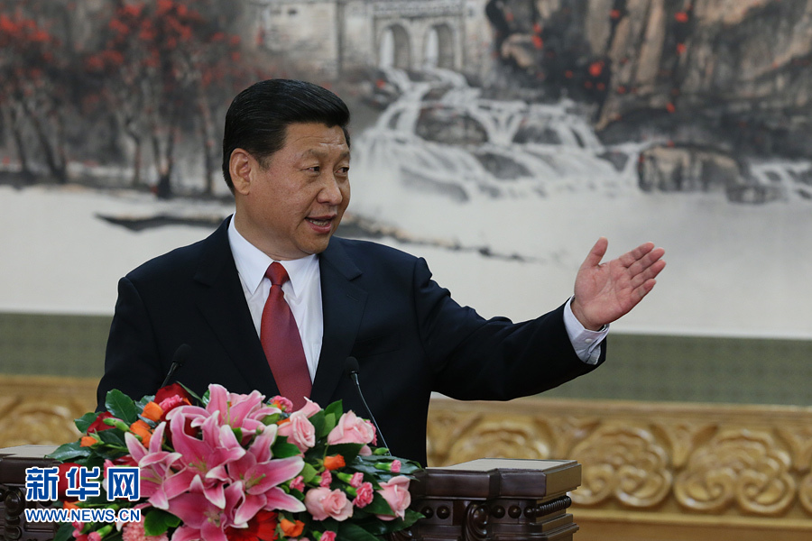 11月15日,剛剛在中共十八屆一中全會(huì)上當(dāng)選的中共中央總書記習(xí)近平和中央政治局常委李克強(qiáng)、張德江、俞正聲、劉云山、王岐山、張高麗在北京人民大會(huì)堂同采訪十八大的中外記者親切見面。這是習(xí)近平總書記發(fā)表講話。(新華社記者 謝環(huán)馳 攝)