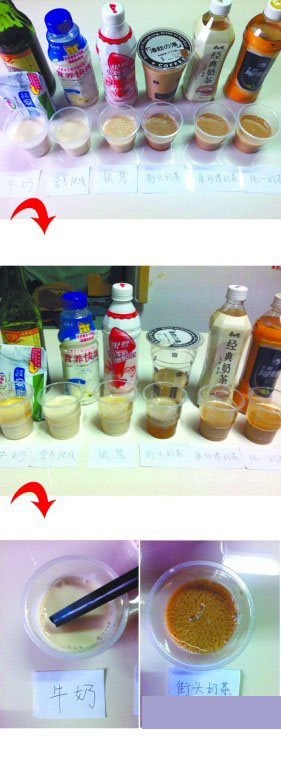 ????11月17日下午,為了驗(yàn)證網(wǎng)上流傳的這種檢驗(yàn)辦法,記者分別買(mǎi)來(lái)了伊利純牛奶、街頭常見(jiàn)的一種“港飲”奶茶、統(tǒng)一阿薩姆奶茶、康師傅經(jīng)典奶茶,同時(shí)為了檢驗(yàn)其他飲料,記者還買(mǎi)了標(biāo)明含有牛奶加果汁的娃哈哈營(yíng)養(yǎng)快線,以及銀鷺花生牛奶。