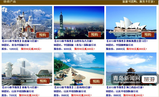 ??? 應(yīng)廣大網(wǎng)友要求,青島新聞網(wǎng)旅游頻道推出“旅游過(guò)春節(jié),早定享鉅惠,預(yù)付50元最高可抵800元”的春節(jié)旅游線路預(yù)售,打造島城旅游業(yè)內(nèi)全新的預(yù)售新概念。盡管距離2013年春節(jié)假期還有兩個(gè)月,但是只要你有計(jì)劃出行,現(xiàn)在即可登錄青島春節(jié)旅游預(yù)售專題報(bào)名,或者撥打咨詢電話:0532-68873225,15063935277。