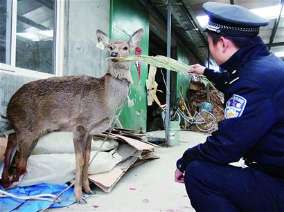 前天下午1時,老劉正在家中做紙箱,突然聽見外面院子里的狗一個勁“汪汪”叫。老劉出門一看,院子里不知啥時進來一只怪模怪樣的動物,看上去像鹿,可臉像馬、尾巴像驢。再仔細看,腿一瘸一拐的,還在流著血。見突然冒出個人來,小家伙也驚著了,沖進旁邊的紙箱堆藏起來。老劉琢磨著應該是個珍稀動物,打電話報了警。