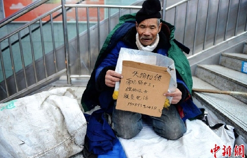 12月11日,臨沂市臨沭83歲的周元武在青島一地下商城邊乞討邊尋找銀行卡失主。連日來,山東青島氣溫降至零下7度,來自臨沂市臨沭83歲的周元武老人一邊在寒風(fēng)中乞討,一邊拿起一個失物招領(lǐng)牌向過路人展示。