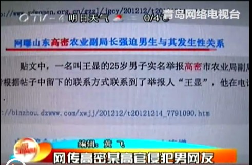????最近,一位名叫“飛在心上T”的網(wǎng)友,在大眾論壇發(fā)表了一條名為“實(shí)名舉報(bào)高密市農(nóng)業(yè)局副局長(zhǎng),誘騙男生強(qiáng)迫發(fā)生性關(guān)系”的帖子。貼子中,一個(gè)名叫王顯的25歲男子,實(shí)名舉報(bào)高密市農(nóng)業(yè)局副局長(zhǎng)聶玉杰,多次誘騙他并強(qiáng)迫與他發(fā)生性關(guān)系多達(dá)5次,同時(shí)還威脅他,不許走漏風(fēng)聲,否則就把他的照片在網(wǎng)上曝光。帖文中敘述說,今年7月份,高密市農(nóng)業(yè)局副局長(zhǎng)聶玉杰加了王顯的qq號(hào),之后倆人以普通朋友的身份在網(wǎng)上聊天,十分投機(jī),而聶玉杰更是讓從小沒有父親的王顯,感受到了父親般的溫暖。兩人在網(wǎng)上聊了五個(gè)月后,今年的10月17號(hào),聶玉杰提出見面,兩人約在了濰坊田思瑞國(guó)際大酒店,并開了房間,之后強(qiáng)迫王顯和他發(fā)生性關(guān)系。