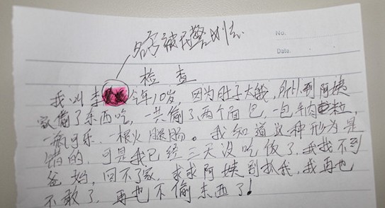 ????原來,28號下午3點左右,自己的小超市正在收貨,當(dāng)時自己看著這孩子進(jìn)的門,但是看他穿的臟兮兮的便留了個心眼,安排人在不遠(yuǎn)處跟著他。果然不一會,這孩子走進(jìn)一排沒人的貨柜,打開面包服就往懷里塞東西,轉(zhuǎn)了幾圈面包服塞滿了東西,被抓了正著,不過這孩子也奇怪,被抓了不哭不鬧,就是讓打電話報警。而正在寫事情經(jīng)過的男孩見到民警來了,主動承認(rèn)是自己拿了超市的東西,問其為何偷超市東西,今年多大了,他說:“我今年10歲了,我也不想偷,可是我餓呀,我爸媽也找不到,老家也回不去,我總不能餓死啊。”說著說著孩子的眼淚就嘩嘩的流了下來!