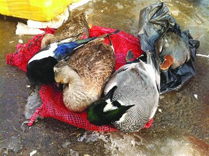 昨天上午,記者來到移風店鎮(zhèn)一處河畔,在通往平度的一座大橋前,有一個賣活魚的攤位,在活魚攤位旁邊,還擺著5只死禽,其中一只為喜鵲,兩只為褐色羽毛的母野鴨子,兩只為頭長藍綠色羽毛的公野鴨子,其中一只公野鴨只有喜鵲那么大小,應該是一只還未成熟的小鴨子。記者注意到,一只野鴨子的嘴巴還未合上,半睜著眼睛,死亡時應該比較痛苦。