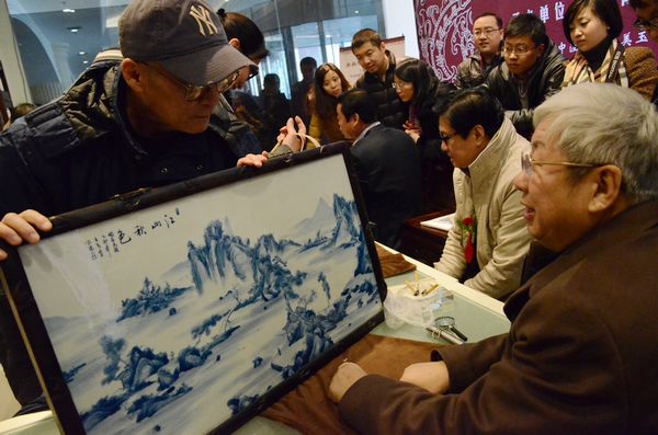 全國著名陶瓷專家毛曉滬(右一)為市民鑒寶