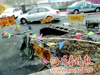 搶修人員已經(jīng)對塌陷路面周邊設(shè)置警示標志。周衍鵬攝