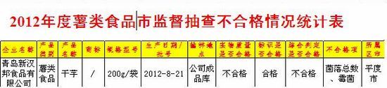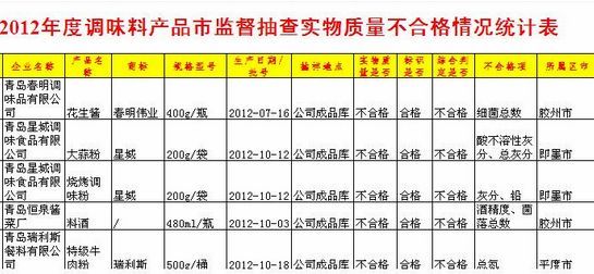 ????昨天青島市質(zhì)監(jiān)局在網(wǎng)站上公布了我市去年第四季度部分食品市質(zhì)量監(jiān)督抽檢結(jié)果,此次抽檢了肉制品、調(diào)味料、醬類、食用油脂制品、蛋制品、薯類食品6類產(chǎn)品,共抽檢了104家企業(yè)的195批次產(chǎn)品,9家企業(yè)的10批次產(chǎn)品被檢出不合格。不合格產(chǎn)品中大部分是產(chǎn)品實(shí)物不合格,僅有1批次產(chǎn)品是標(biāo)簽標(biāo)識(shí)不合格。 ????市質(zhì)監(jiān)局工作人員介紹,這些產(chǎn)品都是在去年7月至10月從企業(yè)成品庫直接取樣的。記者注意到,其中青島宏順食品有限公司生產(chǎn)的五香肉干被檢出檸檬黃、日落黃超標(biāo)。食品專家介紹,人如果長期或一次性大量食用檸檬黃、日落黃等色素含量超標(biāo)的食品,可能會(huì)引起過敏、腹瀉等癥狀,當(dāng)攝入量過大,超過肝臟負(fù)荷時(shí),會(huì)在體內(nèi)蓄積,對腎臟、肝臟產(chǎn)生一定傷害。(記者 孫啟孟) ????其他被曝光的企業(yè)和產(chǎn)品還有: ????青島新漢邦食品有限公司的干芋(不合格項(xiàng):菌落總數(shù)、霉菌) ????膠州市昌盛蛋制品廠的咸鴨蛋(不合格項(xiàng):菌落總數(shù)) ????青島可頌食品有限公司的植脂奶油(不合格項(xiàng):標(biāo)簽) ????青島和旺食品有限公司的黃豆醬(不合格項(xiàng):食鹽項(xiàng)目) ????青島春明調(diào)味品有限公司的花生醬(不合格項(xiàng):細(xì)菌總數(shù)) ????青島星城調(diào)味食品有限公司的大蒜粉(不合格項(xiàng):酸不溶性灰分、總灰分) ????青島星城調(diào)味食品有限公司的燒烤調(diào)味粉(不合格項(xiàng):灰分、鉛) ????青島恒泉醬菜廠的料酒(不合格項(xiàng):酒精度、菌落總數(shù)) ????青島瑞利斯餐料有限公司的特級(jí)牛肉粉(不合格項(xiàng):總氮) |