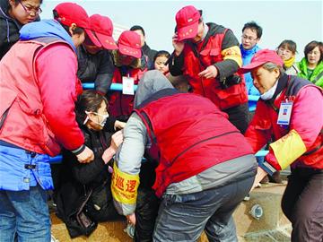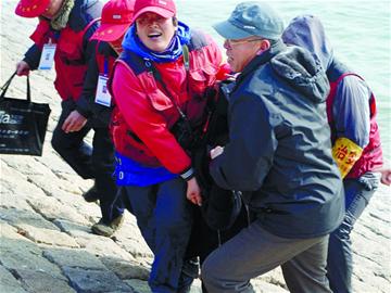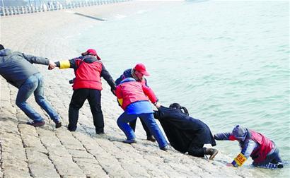 “輕生女子被推到海邊的臺階上后,還是拼命掙扎,就是不想往岸上走?!比f女士介紹說,她的另外一名同事便順著斜坡下到輕生女子身旁,準備和付守庫一起將輕生女子拖到岸上,但輕生女子還是使勁要往海里走,憑兩個人的力氣很難將她弄到岸上。“最后,我們五六個人都上去了,手拉手接力,付守庫在后面推,我們就在前面拉,費了很大的力氣,才把她弄到了欄桿里面?!碑敃r參與救援的崔師傅告訴記者。