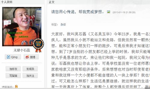 吳石磊在網(wǎng)上的內(nèi)心獨白被全國很多愛心網(wǎng)友微博轉(zhuǎn)發(fā)