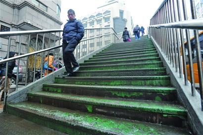 ????據(jù)李女士反映,她所開的服裝店就在離威海路天橋不遠的地方,每當下雪天到來,她便經(jīng)常能看到橋上有人滑倒?!白蛱焱砩虾跓粝够鸬?,一個老人拄著拐棍上的天橋,還沒走上臺階呢,就給滑倒了,坐在地上很長時間都起不來?!崩钆空f道。接到李女士的電話,記者來到威海路附近的過街天橋處,此時天橋處的許多臺階仍然被雪覆蓋著,一些積雪較厚的地方長時間被踩踏,已經(jīng)很結(jié)實地貼在臺階上,通過此處的行人需要緊抓住旁邊的扶手,小心翼翼地走上臺階。對于一些年邁的老人來說,在這種天氣下通過天橋就顯得格外困難。一些老人僅上臺階往往就要花上5分鐘。