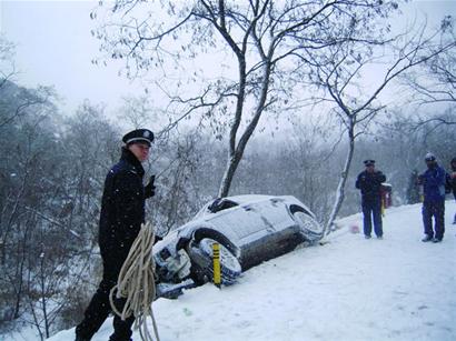 ????昨日下午,嚴(yán)先生和朋友駕車從珠山景區(qū)下山時,因雪天路滑,車輛失控摔在路邊峭壁。救援民警徒步兩公里趕到現(xiàn)場。幸運的是,失控車輛被峭壁邊的一棵大樹擋住,車內(nèi)4人沒有受傷。