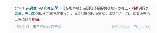 ????央視春晚官方微薄發(fā)出特別聲明:“在剛剛落幕的央視蛇年春晚上,劉謙調(diào)侃李云迪、王力宏的橋段并非導(dǎo)演組設(shè)計,而是劉謙的現(xiàn)場發(fā)揮,純屬個人行為。重播版春晚已將該段落刪除。 ”