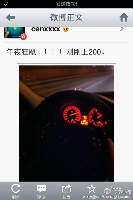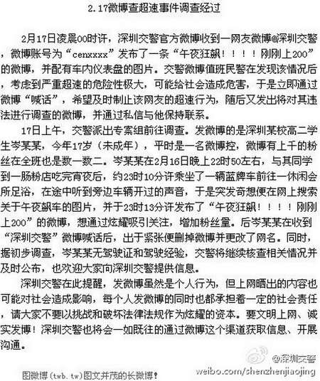 ????今日據(jù)深圳市公安局交警支隊的官方微博消息,昨日凌晨微博上名為“cenxxxx”的網(wǎng)友曬出一張“汽車超速200”的照片,被深圳市公安局交警支隊的官方微博@深圳交警隨即發(fā)現(xiàn)并告誡“嚴(yán)重超速等于自殺!請立即減速,我們會依法調(diào)查?!痹摼W(wǎng)友隨后刪除了此條微博,仍被較真的@深圳交警截屏作為證據(jù)保存,并表示明天等待的將是法律制裁。今日下午15時許,@深圳交警再次發(fā)布微博,表示找到了16日夜間發(fā)布微博曬超速圖片的微博發(fā)布人,為一名深圳在校高二學(xué)生,正在老師陪同下,交警正對其當(dāng)晚活動情況進(jìn)行調(diào)查核實。