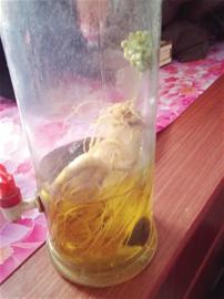 “這棵人參是親戚從東北帶來送給我的,我拿它來泡酒喝。 ”高先生說,這棵人參已經(jīng)在瓶子里面泡了兩年多的時(shí)間,泡參所用的是52°的白酒?!捌綍r(shí)這酒一直儲(chǔ)藏著不動(dòng),只有過年的時(shí)候才拿出來喝,今年春節(jié)我拿出來喝,一看,泡在酒里面的人參竟然發(fā)芽開花了!真的很奇怪?!备呦壬d奮地說。