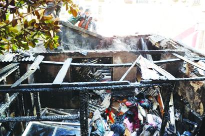 “居民樓門前起火了,來(lái)了三輛消防車! ”昨日下午2時(shí)許,記者接到市民報(bào)料后迅速趕到大連路22號(hào)6號(hào)樓前,路上停著三輛重型水罐車,消防官兵接起了一根100多米長(zhǎng)的水帶沖進(jìn)居民小區(qū)?!斑@里還有明火!”記者順著戰(zhàn)士的呼喊看見,6號(hào)樓前一處占地約10余平方米的臨時(shí)房被燒得只剩下幾根房梁和柱子,石棉瓦全被烤塌陷落在地。消防官兵正站在高處向還在冒煙的屋內(nèi)掃射?!澳菬煯?dāng)時(shí)很大,都飄到五樓去了! ”目擊者陳先生回憶道。
