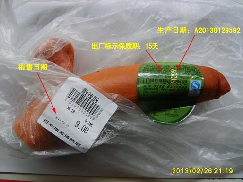 ????2月25日,網(wǎng)友在得利斯歷城路店買的辣腸,由于疏忽回家才仔細(xì)查看辣腸上的貼牌。貼牌上清楚的標(biāo)識:保質(zhì)期15天,生產(chǎn)日期:2013年1月29日。仔細(xì)一算,這辣腸早已超出了15天的保質(zhì)期,店家怎么還售賣呢?網(wǎng)友趕緊原路返回,找到就在家附近的得利斯歷城路店。