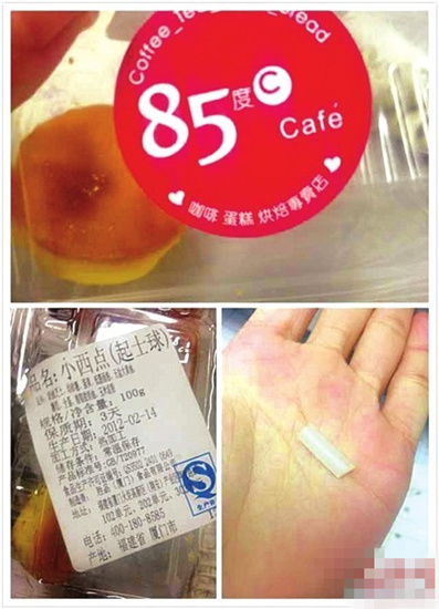 ??? 投訴:2月24日下午,白領(lǐng)彭小姐到85度C石牌橋分店買了兩塊面包和一盒六個裝的起士球,總共花費24元?!靶∨笥殉酝暌粋€起士球后拿了第二個吃,誰知咬了一口就發(fā)現(xiàn)里面夾有一小塊管狀異物?!迸硇〗阏f,小孩吐出一口起士球,里面有一個長約3厘米,呈半透明狀的異物,很像塑料管。“因為完全夾在起士球中間,所以沒咬開前完全看不出來?!迸硇〗阏f,小朋友看到異物后當(dāng)即覺得惡心,幾個大人也因此倒了胃口。彭小姐希望,面包店能給出說法,并且多注意生產(chǎn)衛(wèi)生。