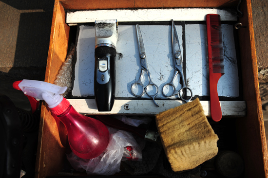 小小工具箱內(nèi)的一把推子、兩把剪子、一把梳子、一把剃刀、幾項(xiàng)簡單的工具就湊成了賈師傅的全部家什。張力偉 攝