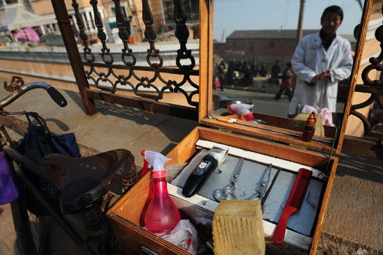 簡單的工具寒酸的行頭與現(xiàn)在裝修豪華的理發(fā)店相比寒磣不少,可仍然吸引了無數(shù)老年人前來。張力偉 攝