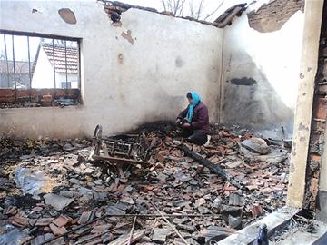 62歲的王培國前年剛蓋的四間房屋,大火過后,家里只剩下燒黑的小麥、玉米,唯一慶幸的是,他家的養(yǎng)豬棚僥幸躲過一劫。在王培國的家中記者看到,四間屋的橫梁、屋頂都沒了,墻面燒得漆黑。存放糧食的房屋內(nèi),只剩下燒黑的玉米粒、燒熟和燒黑的小麥。 “我大致估計了一下,這場大火至少損失兩萬多元,這還不算燒壞的房屋。 ”王培國表示。