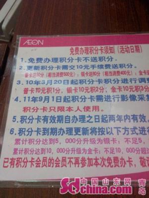 3月12日中午,中國(guó)山東網(wǎng)青島頻道記者來(lái)到佳世客香港中路店服務(wù)中心,記者看到在服務(wù)中心柜臺(tái)顯眼的位置,貼了一張辦理積分卡須知,根據(jù)須知內(nèi)容顯示,積分卡有效期自辦理之日起兩年內(nèi)有效,到期更新積分卡需交10元手續(xù)費(fèi)。積分卡積分原則為,普卡10元積一分,銀卡10元積2分,金卡10元積3分。