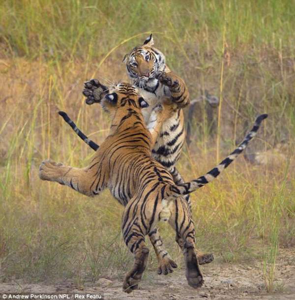 據(jù)英國《每日郵報》3月27日刊登了一組兩只幼虎打斗的精彩畫面。照片中,這兩只年幼的孟加拉虎在印度斑德哈瓦加國家公園嬉鬧大打出手,精疲力竭后躺在池邊休憩。這兩只幼虎打斗極為激烈,又撕又咬,甚至一度扭打在一塊。它們的打斗一直從地上持續(xù)到附近的水池。但它們并未因此而停止,而是在水里繼續(xù)打斗。盡管它們的打斗看似激烈,事實(shí)上它們只是通過打斗來舒展筋骨。最后,這兩只孟加拉虎打累了便并排躺在池邊休息以恢復(fù)體力。