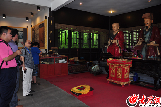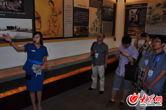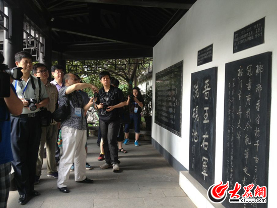 在“王羲之故居”的歷代名人展廳內(nèi),媒體行記者們聽取講解,記錄下這座歷史文化名城的人文情懷
