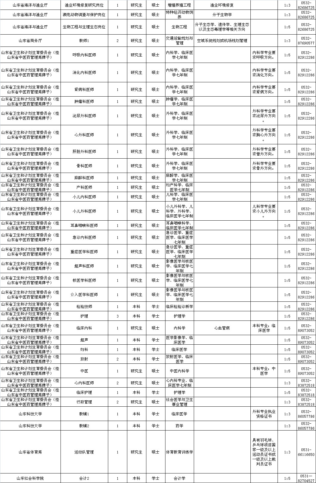 ????2014年山東省屬事業(yè)單位公開招聘工作人員807名,主要集中在教育類和衛(wèi)生類崗位,其中位于青島的崗位招考42人,主要包括山東社會科學(xué)院海洋經(jīng)濟研究所1人、青島大學(xué)附屬醫(yī)院22人,山東省青島療養(yǎng)院(省青島慢性病醫(yī)院、省康復(fù)中心)6人,青島大學(xué)心血管病研究所(青島大學(xué)附屬心血管病醫(yī)院)5人,山東省青島體育訓(xùn)練中心1人,山東省海洋生物研究院3人,山東外貿(mào)職業(yè)學(xué)院2人,山東科技大學(xué)2人。