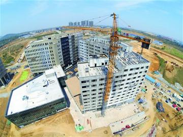????空拍的第二站是德國企業(yè)中心,它也是中德生態(tài)園區(qū)中“最德國”的地方。目前,建設中的德國企業(yè)中心已初具規(guī)模。當多旋翼無人機向上爬升,豎立著塔吊的德國企業(yè)中心進入了畫面中。四處水泥建筑三處相連,一處隔路向往,輪廓很清晰。高度定格在100米時,建筑看上去像是J、L字母,還有的看上去像個梯形。當高度繼續(xù)向上升高時,從側面看這些龐然大物的水泥建筑,更像是一塊塊剛毅的巖石,穩(wěn)穩(wěn)地矗立在中德生態(tài)園中。