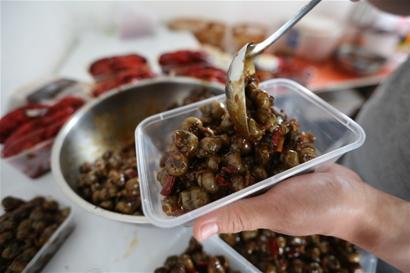 ????與劉博、李興強(qiáng)的見(jiàn)面時(shí)間選在他們一天中最忙碌的時(shí)候——上午9點(diǎn)半。當(dāng)記者來(lái)到他們位于振華路只有30平米的門店時(shí),李興強(qiáng)正手拿大勺站在煤氣灶前,不停地?cái)嚢柚诲佅憷毙罚硪贿叺腻伬镎隣F著麻辣田螺,濃郁的香辣味彌漫了整個(gè)小屋。一旁的劉博站在冰箱前,邊給兩部手機(jī)充電,邊翻看著顧客的訂單,并一一記下來(lái)。隨后,他將已經(jīng)出鍋的醬香魷魚(yú)裝到餐盒中,包上印有店名的標(biāo)貼。
