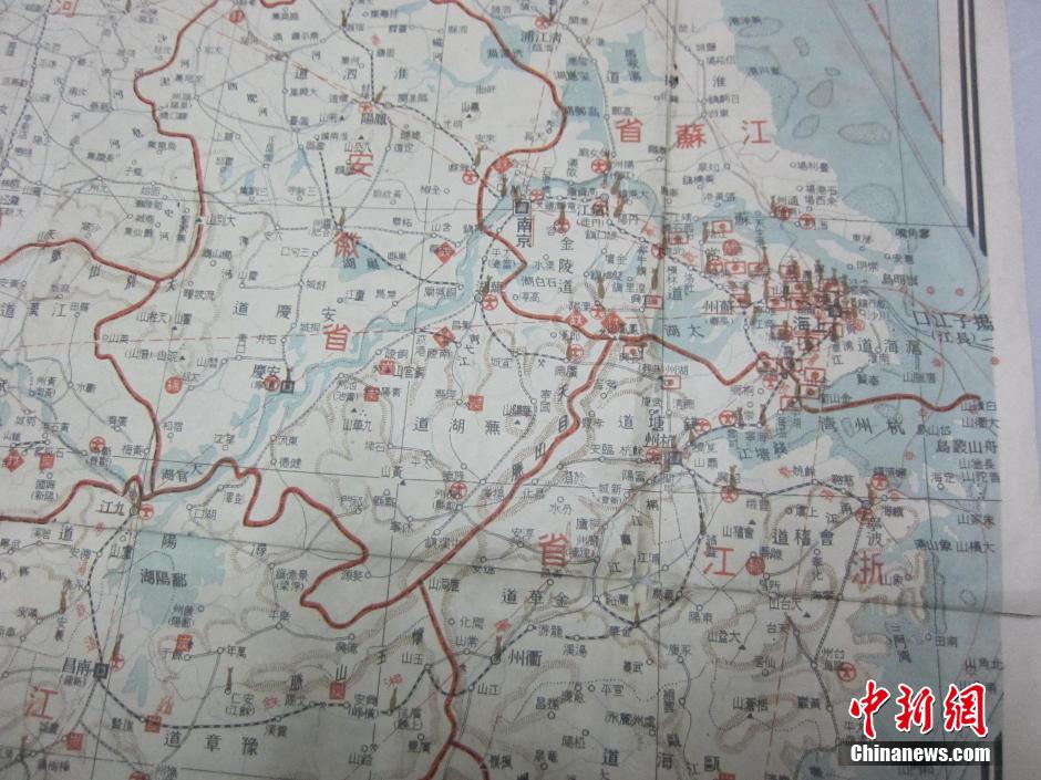 ????近日,湖南郴州北湖區(qū)發(fā)現(xiàn)一張由日本“日の出編輯局編篡”的《支那最新大地圖》。這張日本侵華作戰(zhàn)地圖發(fā)行于1938年1月1日,左側(cè)印有“特別注明,不許復(fù)制”字樣。地圖上詳細(xì)標(biāo)注了當(dāng)時中國中東部各省政府所在地、機場、鐵路、河道,以及石油、煤炭、鐵、羊毛等盛產(chǎn)地,還有國民政府所設(shè)無線電臺地點。地圖的背面還印制了《皇軍新兵器寫真一覽》,左上方注明“日本陸軍少將大場彌平編篡”。中新社發(fā)黃信粼 攝
