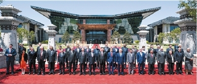 ???? 5月15日中午,習(xí)近平同與會(huì)領(lǐng)導(dǎo)人和國際組織負(fù)責(zé)人以國際會(huì)議中心“漢唐飛揚(yáng)”主建筑為背景集體合影。 新華社照片