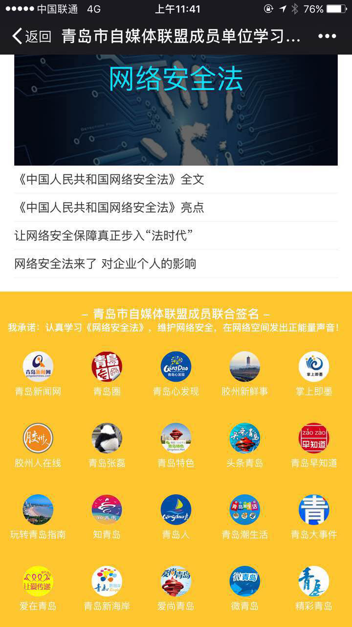 ????青島市自媒體聯(lián)盟還推出移動網(wǎng)絡(luò)專題,通過互聯(lián)網(wǎng)平臺宣傳《網(wǎng)絡(luò)安全法》。