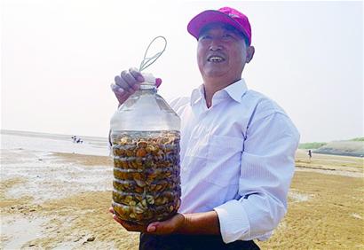 昨天上午10時許,記者來到離黃島市區(qū)3公里的大漿口海域看到,蹲在海邊挖蛤蜊的市民有100多人,他們姿態(tài)各異,有蹲著的,有哈著腰的,還有干脆跪在地上的。他們用菜刀或小鋤頭將海沙挖開幾厘米深,一個個花皮蛤蜊就露了出來。記者在現(xiàn)場看到,市民李先生不一會兒就挖了一大把,樂得合不攏嘴。他告訴記者,原本是來找樂兒的,沒想到1小時就挖了七八斤。