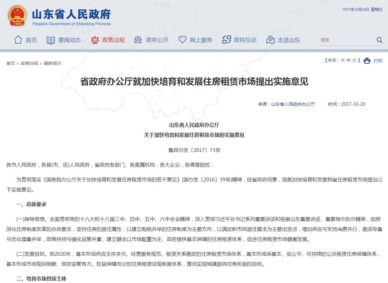 齊魯網(wǎng)10月22日訊(記者楊婷婷)日前,山東省政府辦公廳印發(fā)《關(guān)于加快培育和發(fā)展住房租賃市場的實施意見》(以下簡稱意見),提出建立健全以市場配置為主、政府提供基本保障的住房租賃體系,促進住房租賃市場健康發(fā)展。