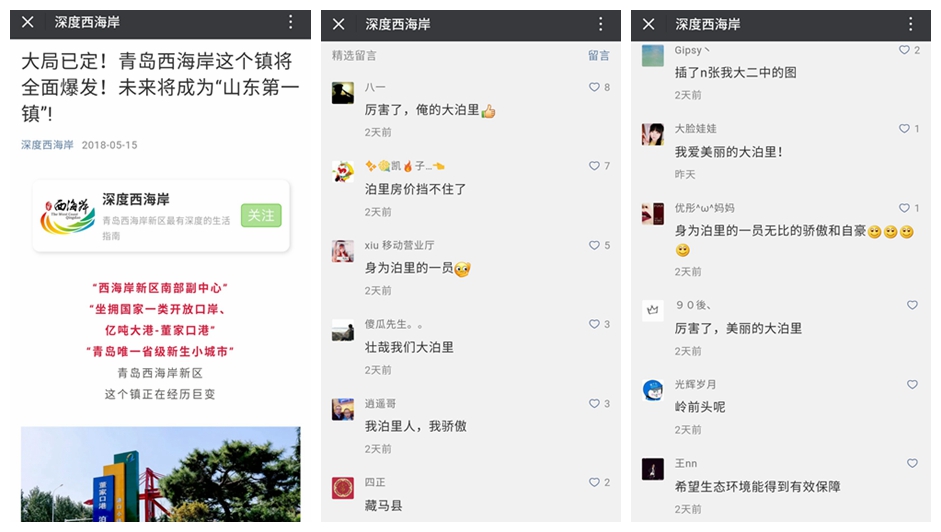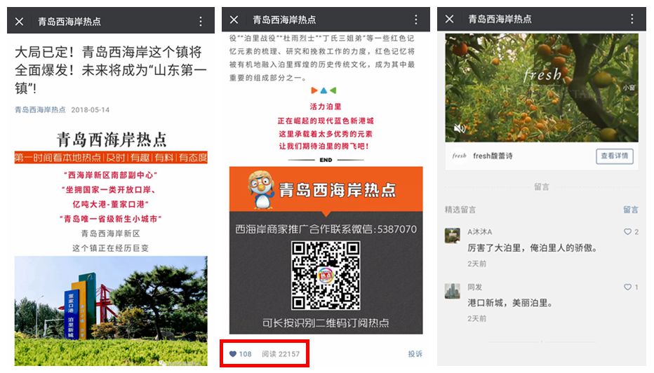 其中“青島西海岸熱點(diǎn)”發(fā)布的“大局已定!青島西海岸這個(gè)鎮(zhèn)將全面爆發(fā)!未來將成為“山東第一鎮(zhèn)”!”一文用各種權(quán)威數(shù)據(jù)解讀了泊里的新發(fā)展,受到網(wǎng)友的一致關(guān)注,閱讀達(dá)到22157次,點(diǎn)贊108次。
