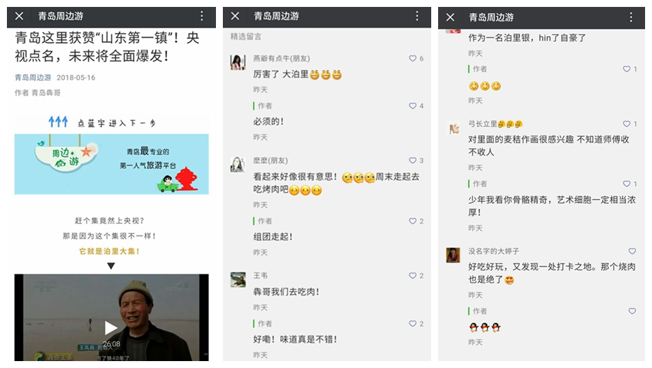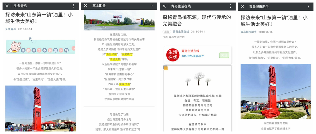 傳播策略 | 利用青島市自媒體聯(lián)盟微信、微博、網(wǎng)頁、報(bào)刊、客戶端、論壇、今日頭條、百家號(hào)等媒體平臺(tái)發(fā)布泊里采風(fēng)稿件,全方位介紹泊里美食、美景、文化、經(jīng)濟(jì)等方面,最終達(dá)到全程引爆的效果。 |