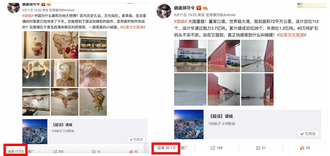“鍋蓋頭司令”在探訪當(dāng)天連發(fā)兩條微博,第一條是介紹泊里麥草畫,閱讀達(dá)17.7萬次,轉(zhuǎn)發(fā)252次,評(píng)論13個(gè),點(diǎn)贊32次;第二條介紹董家口港,閱讀20.1萬,轉(zhuǎn)發(fā)149次,評(píng)論21個(gè),點(diǎn)贊33次。兩篇微博累計(jì)閱讀達(dá)37.8萬,作為全國知名大V,“鍋蓋頭司令”兩篇微博的發(fā)布,讓泊里走出青島,進(jìn)入全國網(wǎng)友視線。