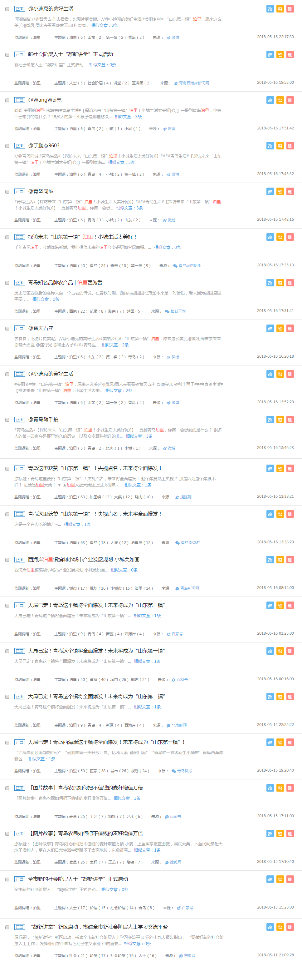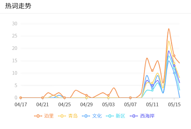 從熱詞走勢(shì)表中我們可以看到,5月11日前關(guān)于泊里的熱門詞匯一直處于0-5之間徘徊,5月11日之后,清博大數(shù)據(jù)后臺(tái)監(jiān)控到泊里、青島、文化、新區(qū)、西海岸等熱門詞匯呈爆發(fā)式遞增狀態(tài),尤其是5月14日當(dāng)天關(guān)于泊里的熱門詞匯更是接近30,充分體現(xiàn)出新媒體的傳播效果。