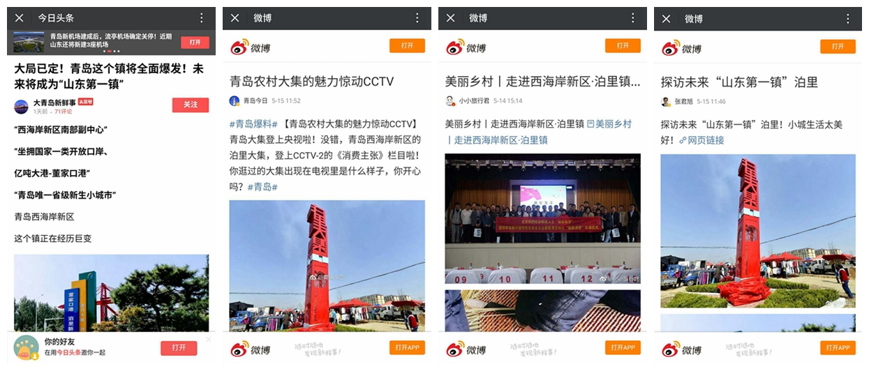 “青島周邊游”發(fā)布的“青島這里獲贊“山東第一鎮(zhèn)”!央視點(diǎn)名,未來將全面爆發(fā)!”從泊里大集為出發(fā)點(diǎn)介紹了泊里的麥草畫、紅席、泊里美食、美景等特色,吸引大批網(wǎng)友把泊里作為旅游目的地。