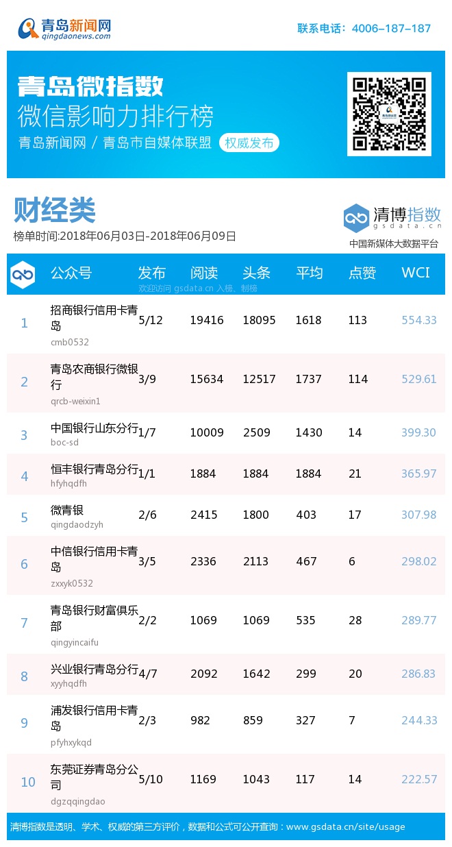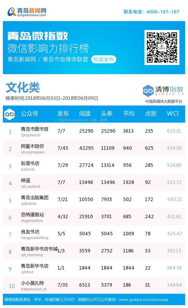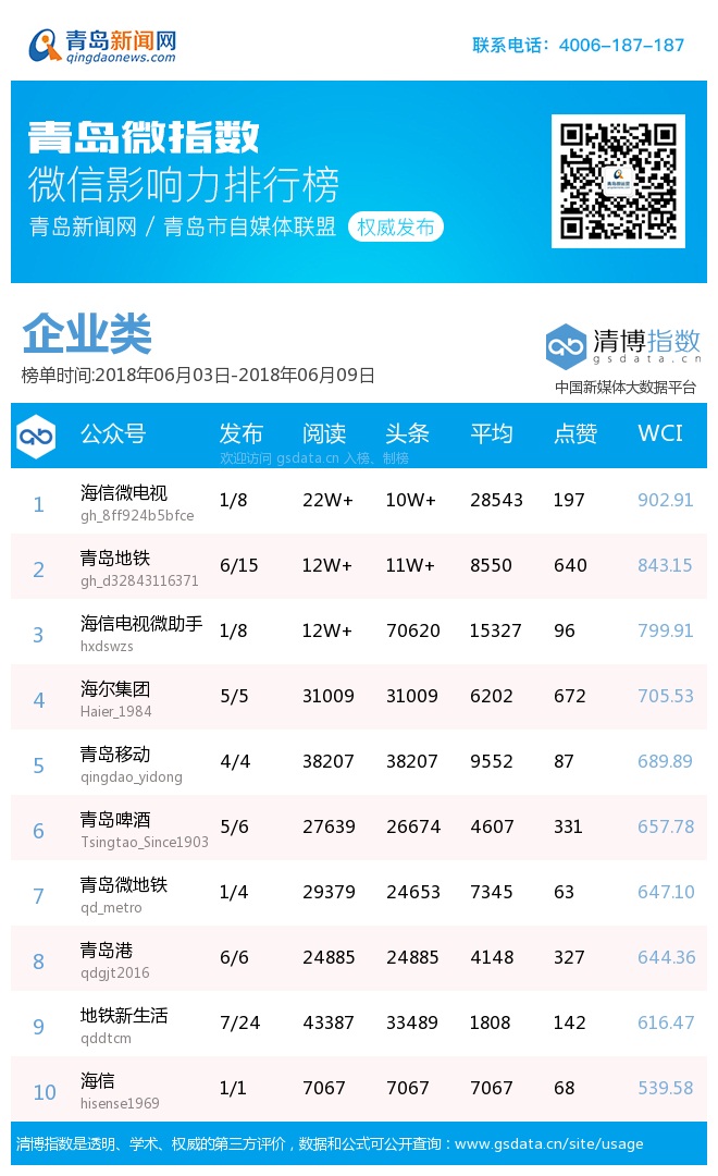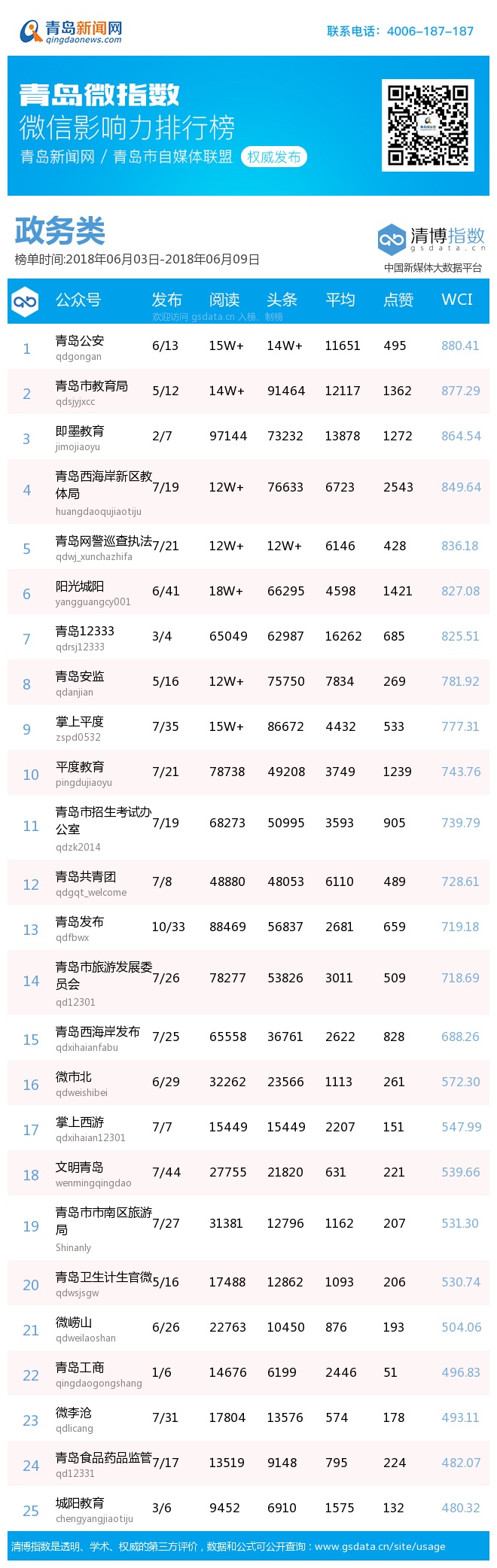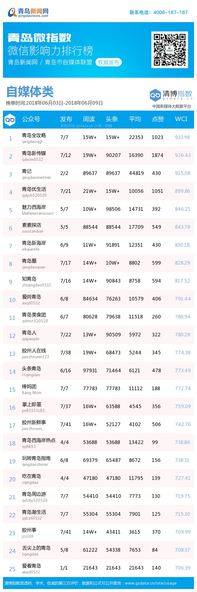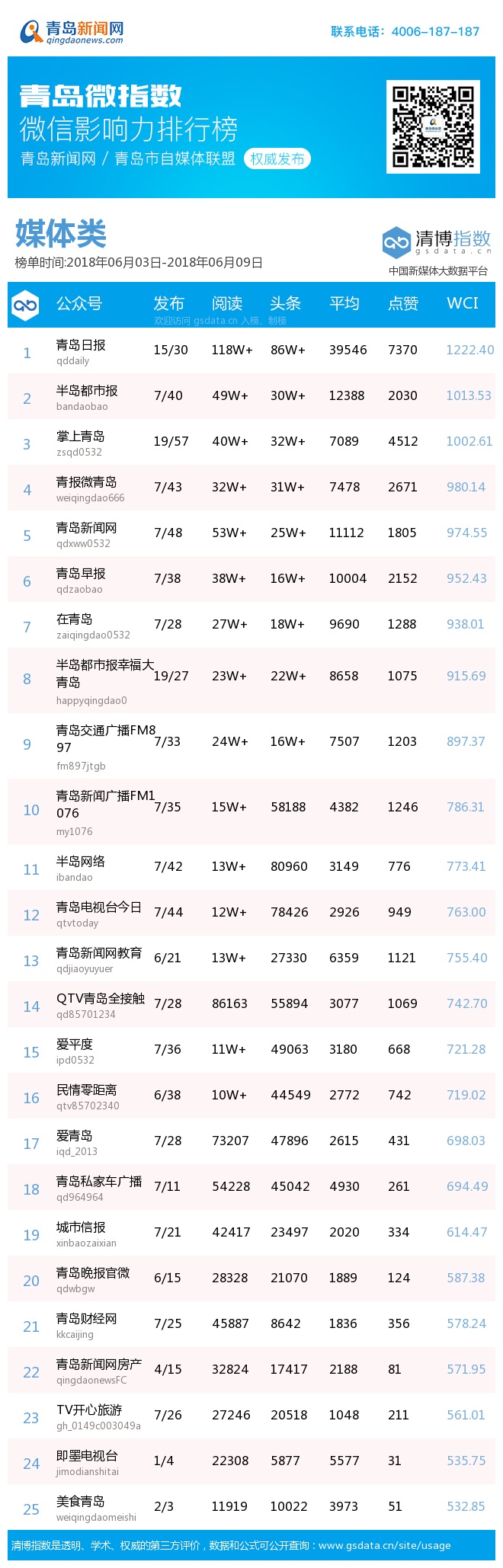 青島新聞網(wǎng)訊6月20日訊(記者 邢書玲)由青島新聞網(wǎng)、清博指數(shù)平臺(tái)聯(lián)手打造的“青島微指數(shù)微信影響力排行榜”今日發(fā)布一周(6.3—6.9)榜單。