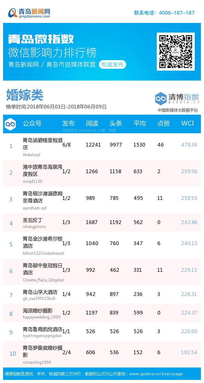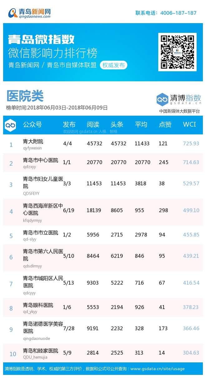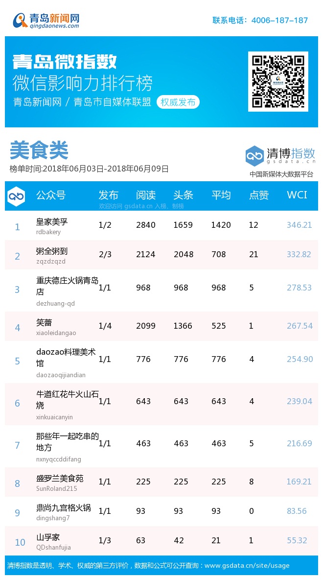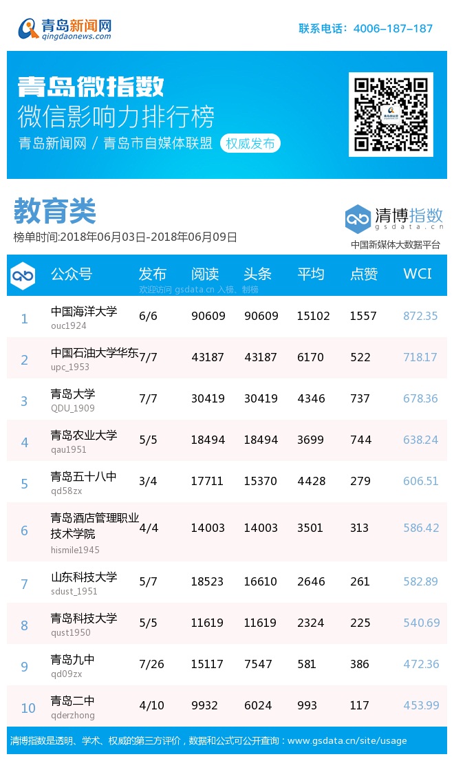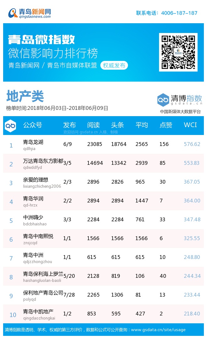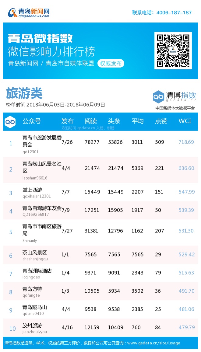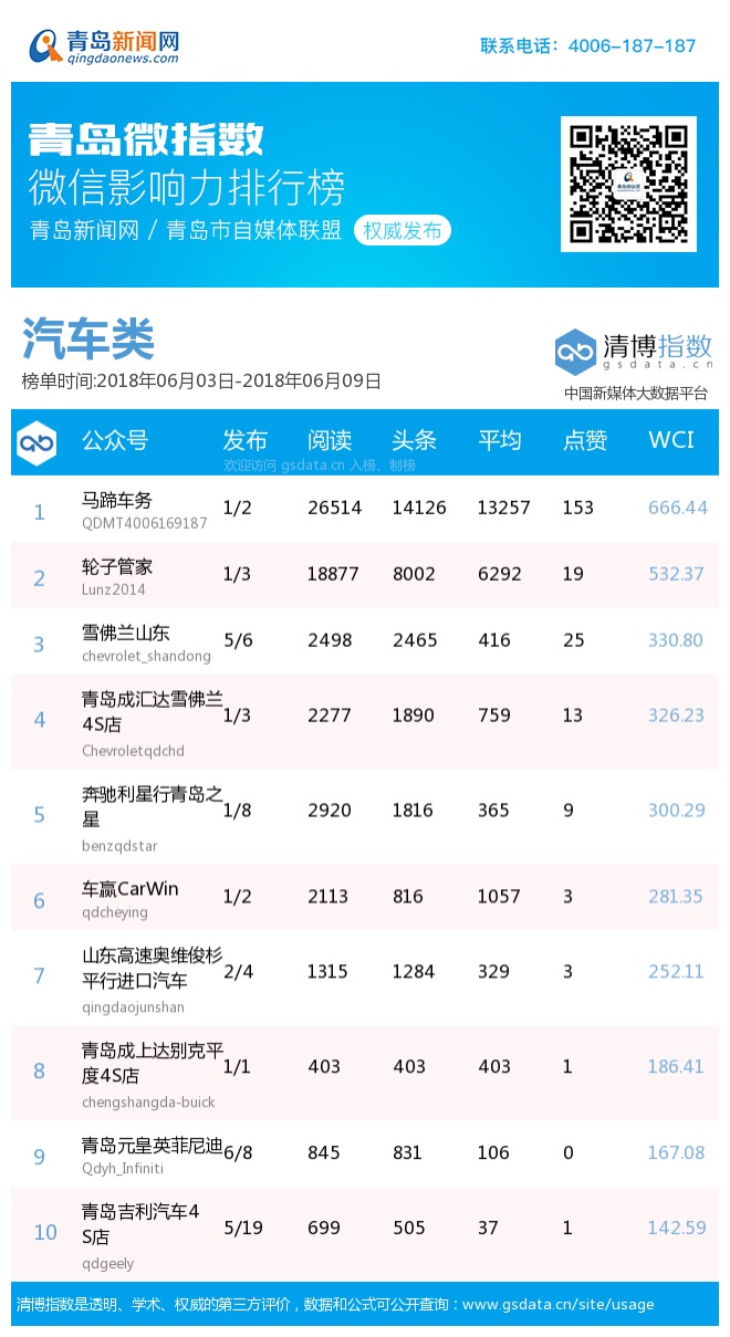青島新聞網(wǎng)訊6月20日訊(記者 邢書玲)由青島新聞網(wǎng)、清博指數(shù)平臺(tái)聯(lián)手打造的“青島微指數(shù)微信影響力排行榜”今日發(fā)布一周(6.3—6.9)榜單。