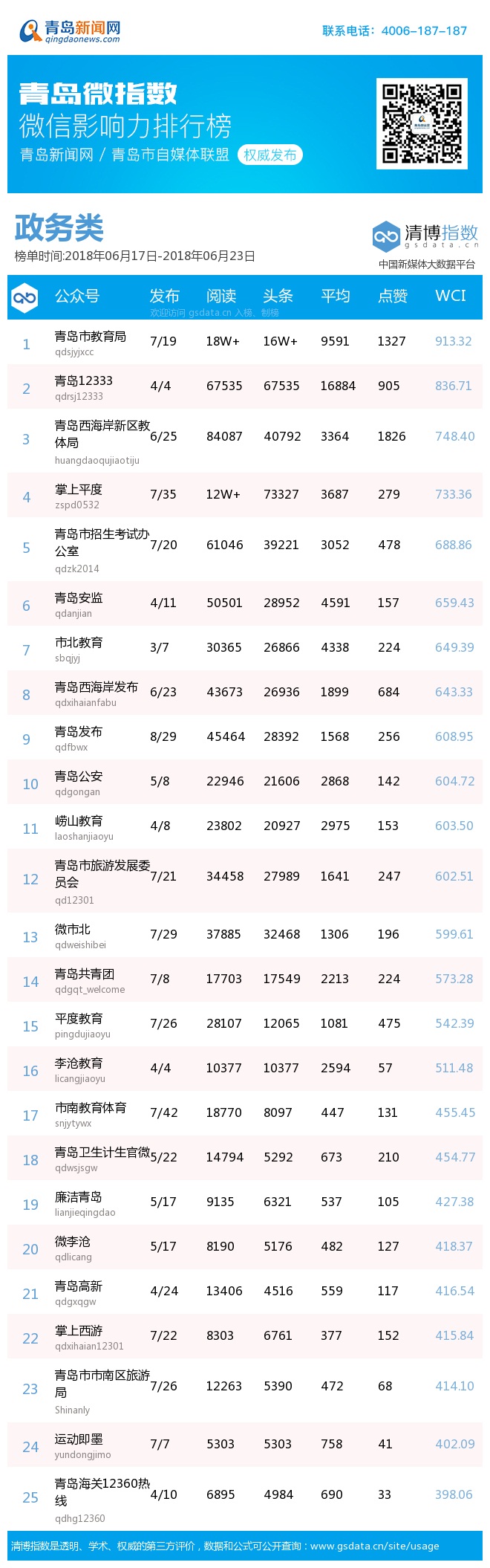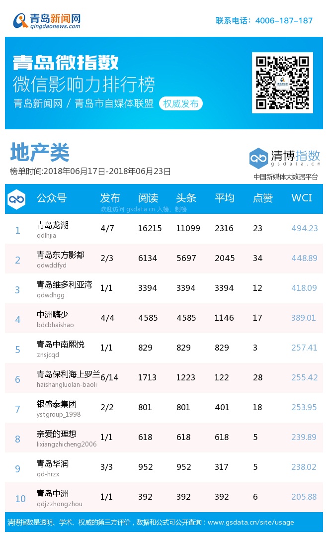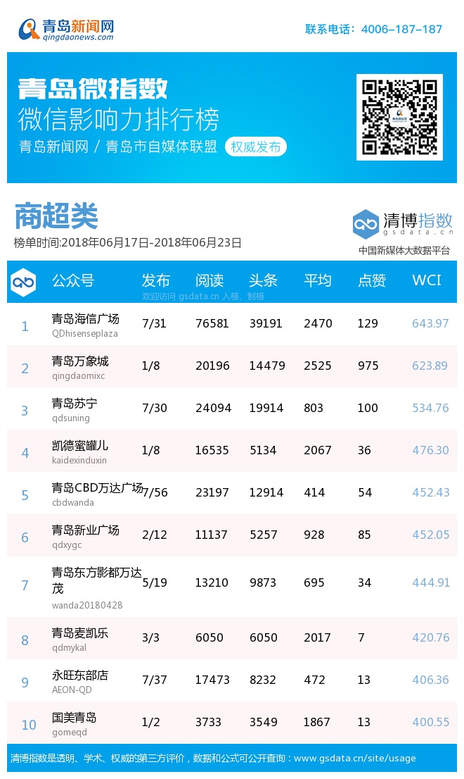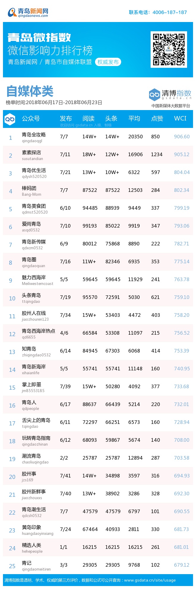 青島新聞網(wǎng)6月25日訊(記者 邢書(shū)玲)由青島新聞網(wǎng)、清博指數(shù)平臺(tái)聯(lián)手打造的“青島微指數(shù)微信影響力排行榜”今日發(fā)布一周(6.17—6.23)榜單。