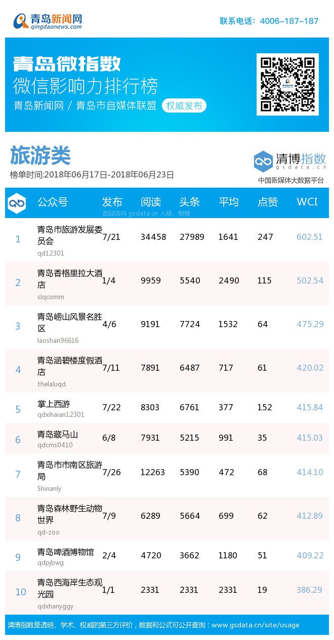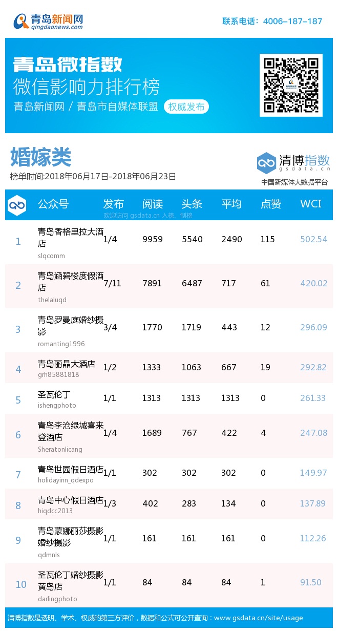 3、本次榜單收錄了青島14個(gè)行業(yè)微信公眾號(hào),如您的賬號(hào)暫未收錄,可聯(lián)系4006-187-187。