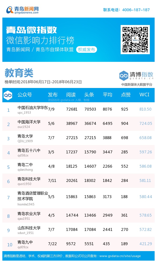 政務(wù)類(lèi)榜單中,“青島市教育局”重回榜首,“青島12333”、“青島西海岸新區(qū)教體局”、“掌上平度”、“青島市招生考試辦公室”緊隨其后,分別占據(jù)榜單前五名。熱文榜中,“青島市教育局”發(fā)布的“重磅 |青島市初中學(xué)業(yè)水平考試與普通高中招生改革實(shí)施方案”,成為本周熱點(diǎn),引發(fā)大家一致關(guān)注,截至目前該文章閱讀10萬(wàn)+,點(diǎn)贊525次。
