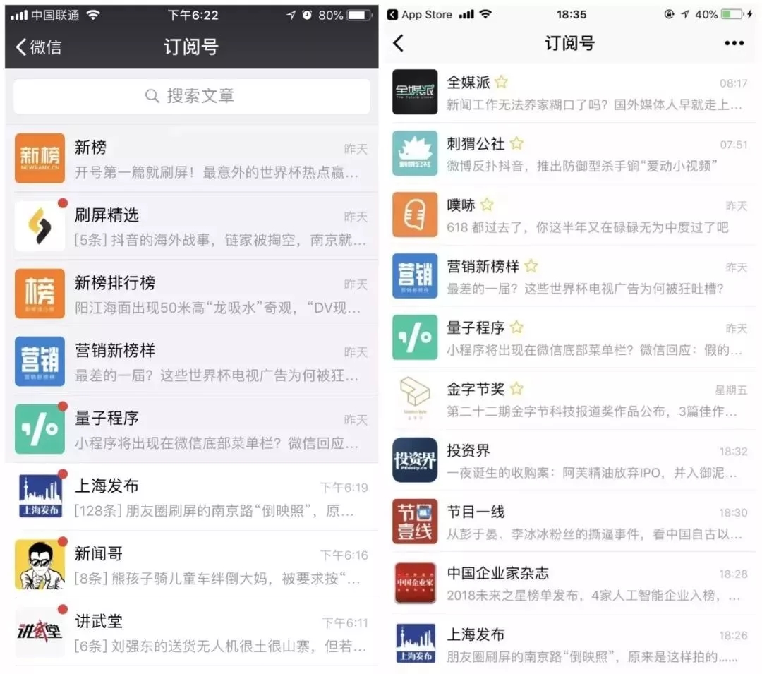 用戶此前置頂?shù)挠嗛喬柮Q前出現(xiàn)“星標”,“星標”訂閱號消息同樣按照時間排序,不再置于最頂部位置。同時,在微信聊天主界面的訂閱號列表盒子和進入后的訂閱號消息列表里,都會以星標提示閱讀。用戶可以繼續(xù)把訂閱號設為星標。