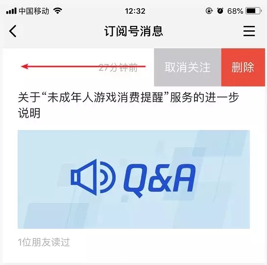 改版后:在信息流里,向左滑動公眾號名稱,即可快速取關(guān)。