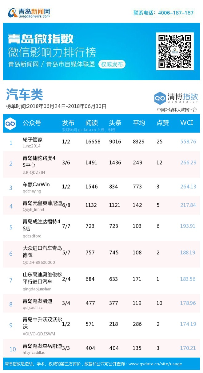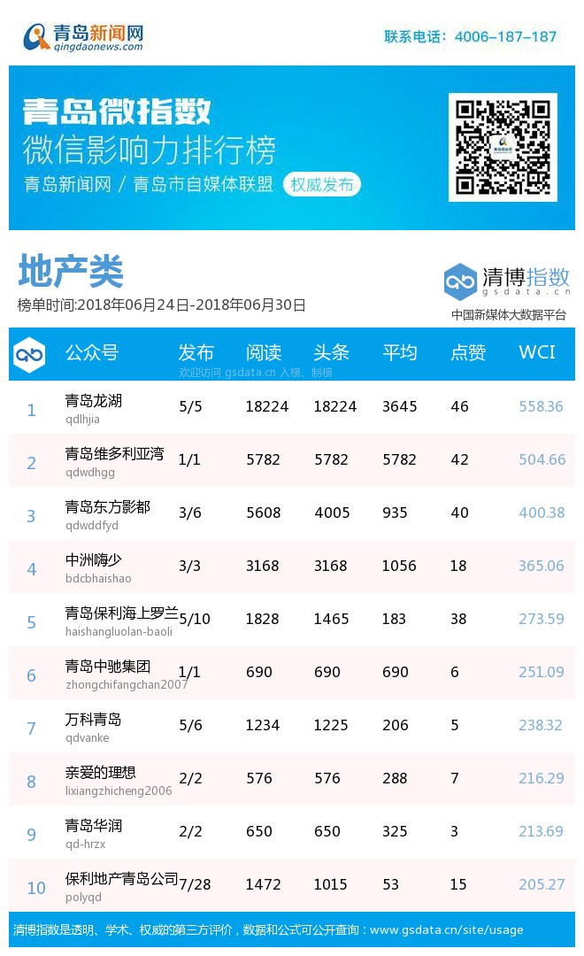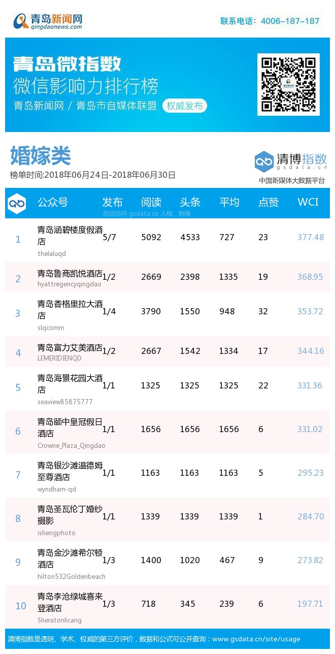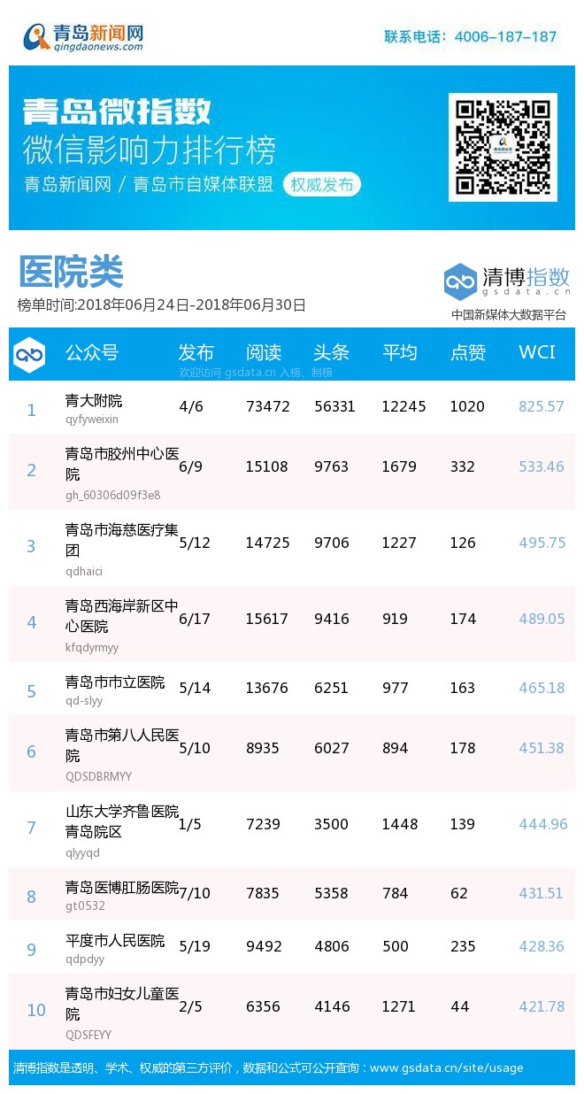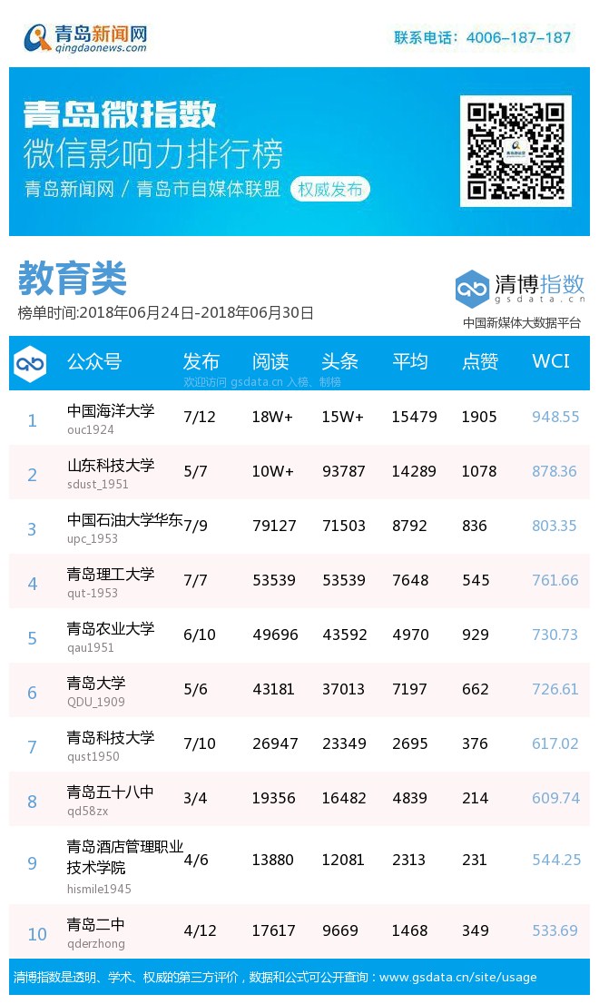 青島新聞網(wǎng)7月2日訊(記者 邢書玲)由青島新聞網(wǎng)、清博指數(shù)平臺聯(lián)手打造的“青島微指數(shù)微信影響力排行榜”今日發(fā)布一周(6.24—6.30)榜單。