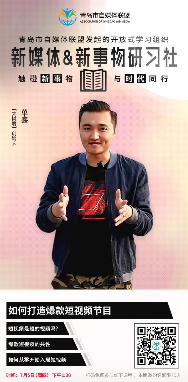 新媒體&新事物研習社由青島市自媒體聯(lián)盟發(fā)起,以“觸碰新事物,與時代同行”為口號,是一個基于新媒體文化的開放式學習組織。所有對新媒體、新事物有自己獨特見解的各行業(yè)優(yōu)秀人士均可申請成為研習社的特邀主講人,所有希望能在思想碰撞中不斷提升自己的各界人士均可申請加入我們。
